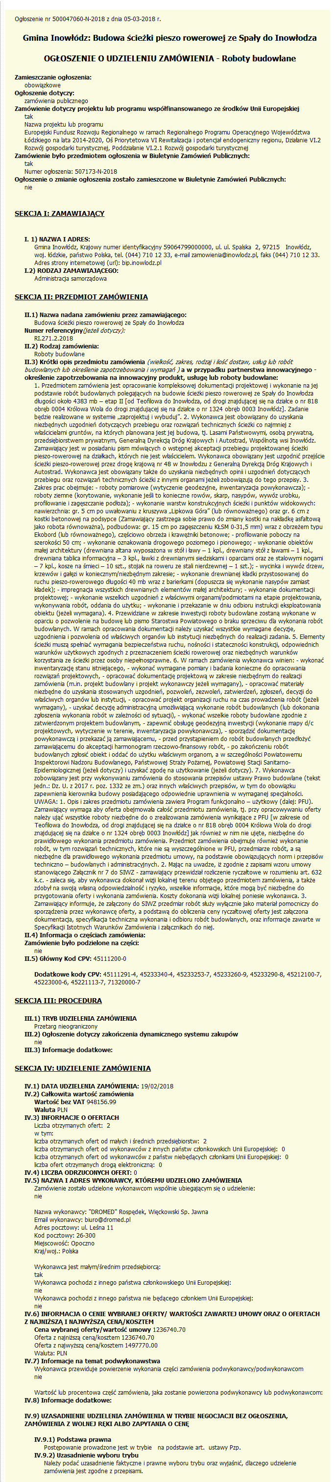 OGŁOSZENIE O UDZIELENIU ZAMÓWIENIA: Budowa ścieżki pieszo rowerowej ze Spały do Inowłodza